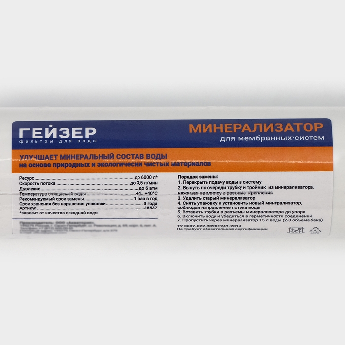 Минерализатор B (RO) предназначен для обогащения полезными минеральными солями (магния и кальция) и микроэлементами воды, очищенной системой обратного осмоса. Минерализатор не подлежит восстановлению, после окончания ресурса заменяется на новый.