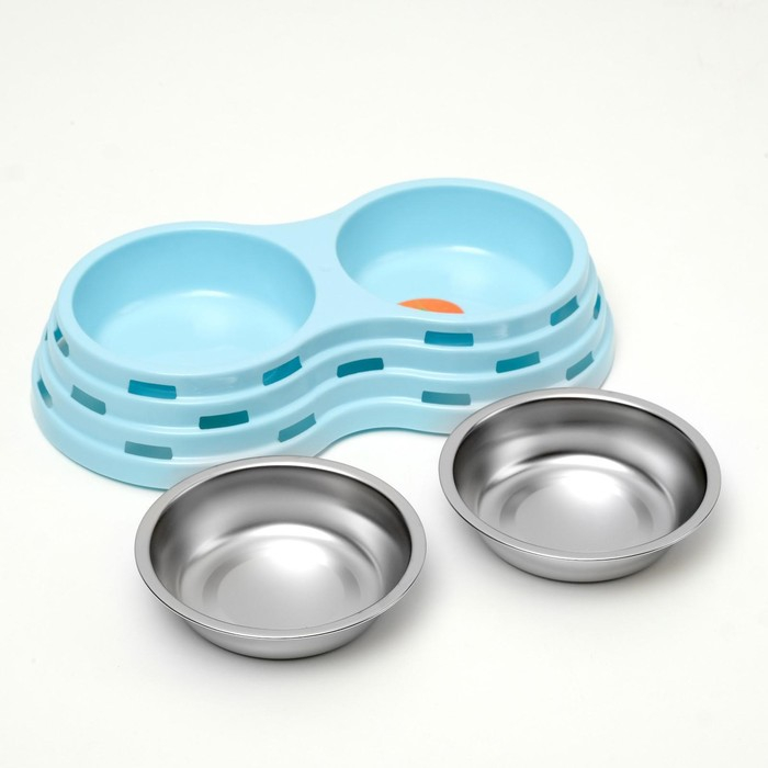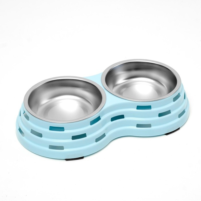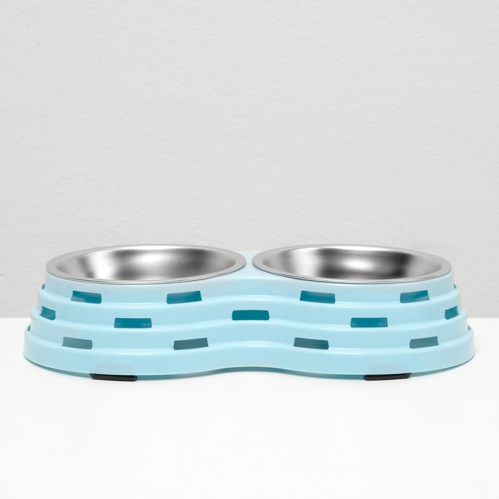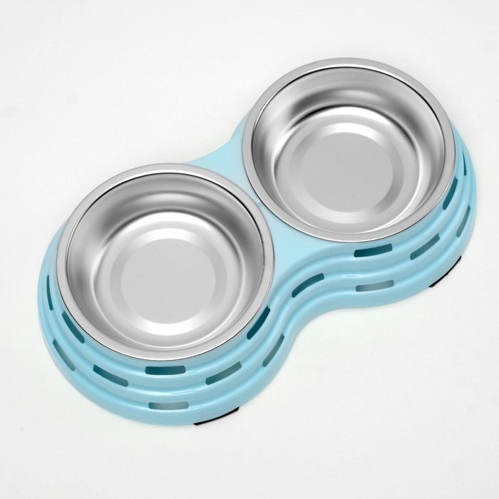 Миска металлическая двойная на пластиковом основании 2 х 160 мл, 25 х 14 х 5 см, голубая