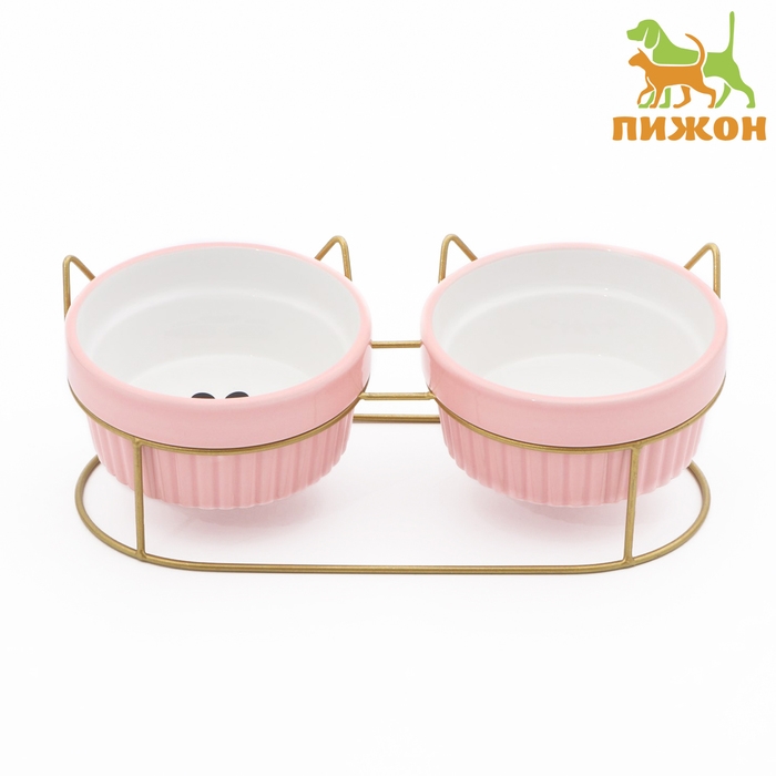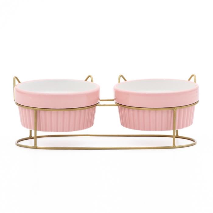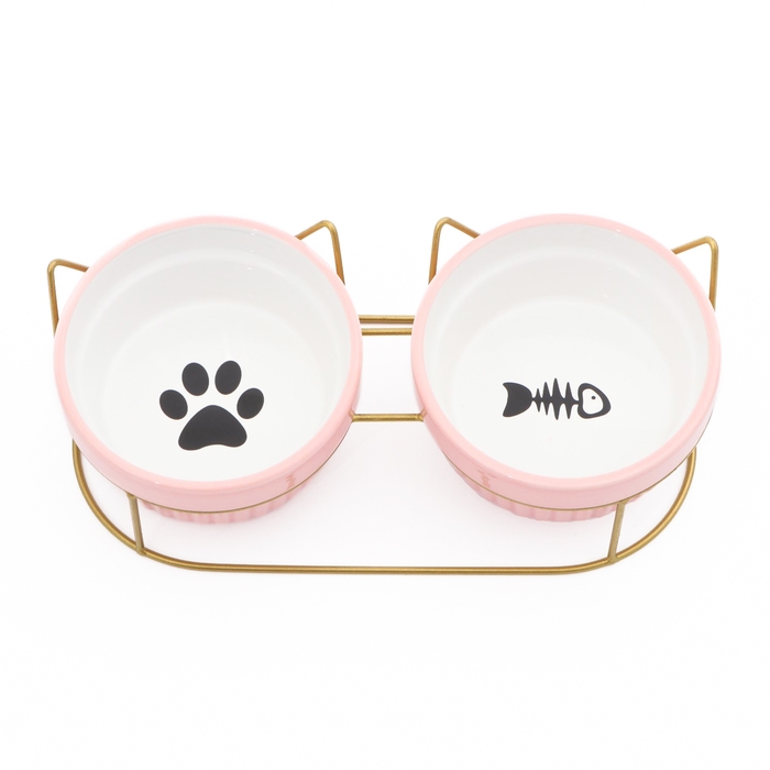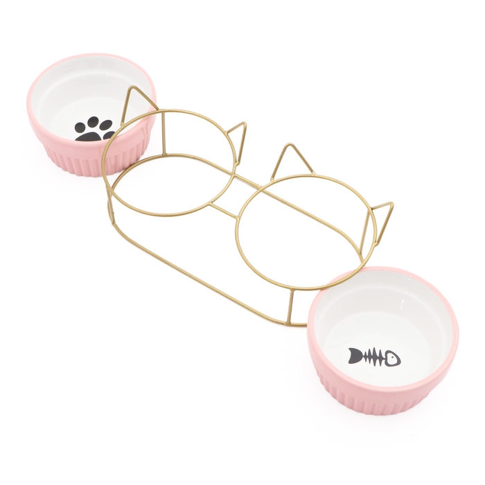 Каждая миска выполнена из высококачественной керамики, что обеспечивает долговечность и лёгкость в уходе. Особенность этого набора — двойная конструкция, благодаря которой можно одновременно размещать в мисках воду и корм. Подставка с ножками обеспечивает устойчивость и предотвращает скольжение, а также защищает поверхность от загрязнений.