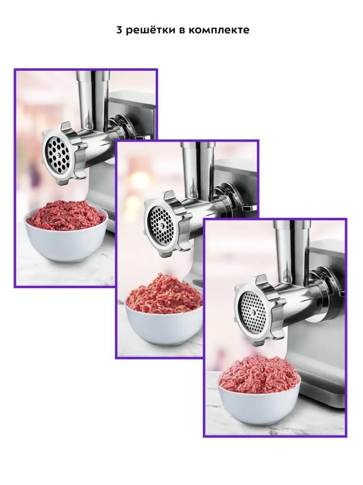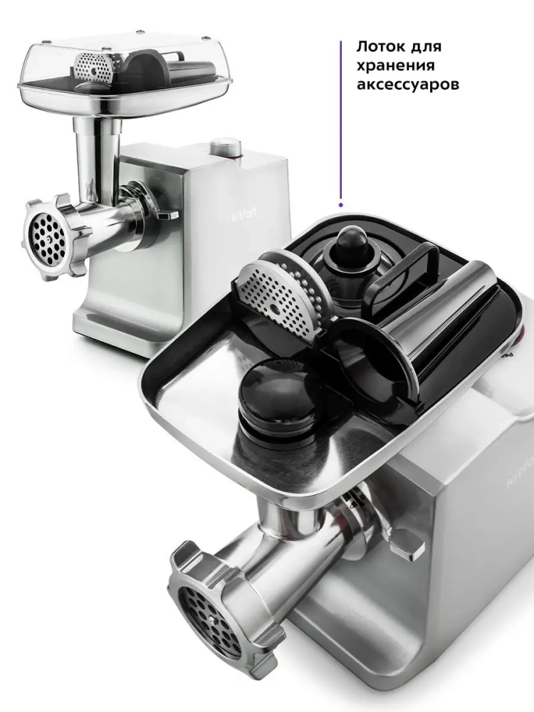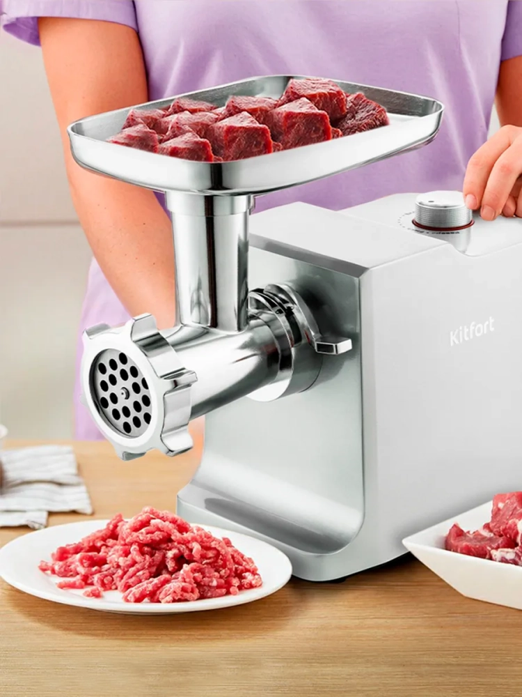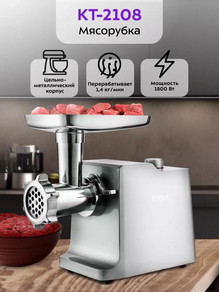 Мясорубка Kitfort KT-2108 оснащена мотором высокой мощности. Корпус устройства выполнен из металла. Мясорубка имеет одну скорость работы и функцию реверса. В комплект входят 3 решетки для изготовления фарша, а также специальные насадки для колбас и кеббе. Корпус и лоток мясорубки легко мыть и чистить. Эта модель удобна в использовании и отличается хорошей производительностью, а ее привлекательный внешний дизайн украсит любую кухню.