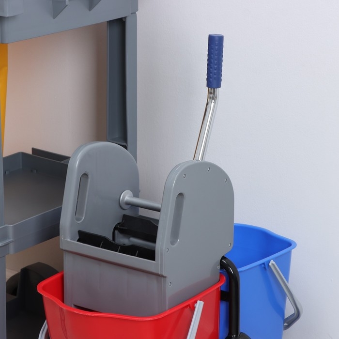 Многофункциональная тележка для клининга с вёдрами, отжимом и лотками, цвет серый