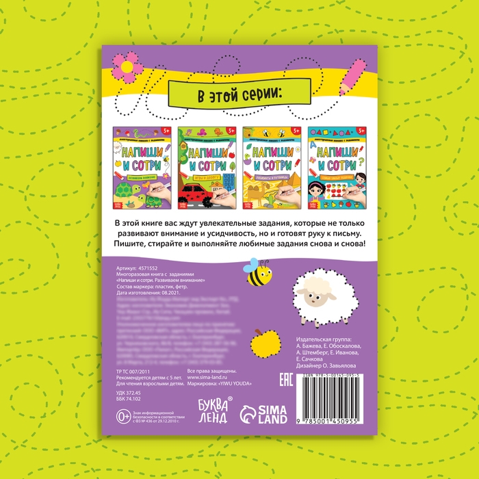 Многоразовая книжка с заданиями «Напиши и сотри. Развиваем внимание», 12 стр.