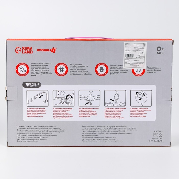Вращающаяся музыкальная карусель поможет убаюкать малютку. Во время бодрствования грудничок будет с интересом наблюдать за движением весёлых фигурок, научится распознавать звуки, цвета и формы. Подросший малыш начнёт тянуться ручками к игрушкам: так ребёнок тренирует координацию движений и пробует оценивать расстояние до предметов.