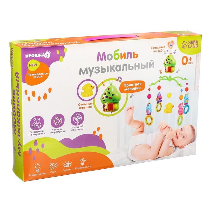 Вращающаяся музыкальная карусель поможет убаюкать малютку. Во время бодрствования грудничок будет с интересом наблюдать за движением весёлых фигурок, научится распознавать звуки, цвета и формы. Подросший малыш начнёт тянуться ручками к игрушкам: так ребёнок тренирует координацию движений и пробует оценивать расстояние до предметов.