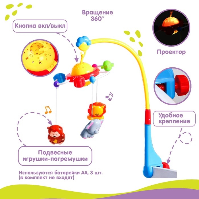 Мобиль на кроватку, проигрывающий колыбельные мелодии, отличная игрушка и подарок для малыша от 0 мес. Его можно прикрепить с помощью кронштейна, который идет в комплекте, на кроватку или коляску. Основа с игрушками вращается на 360 градусов. Все погремушки съемные, ими можно играть по отдельности, а также их очень удобно мыть. Мобиль работает от батареек АА 3 шт