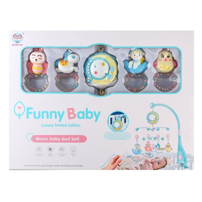 Мобиль на кроватку, проигрывающий колыбельные мелодии, отличная игрушка и подарок для малыша от 0 мес. Его можно прикрепить с помощью кронштейна, который идет в комплекте, на кроватку или коляску. Основа с игрушками вращается на 360 градусов. Все погремушки съемные, ими можно играть по отдельности, а также их очень удобно мыть. Мобиль работает от батареек
