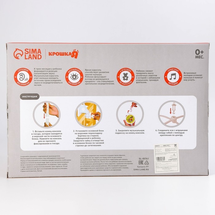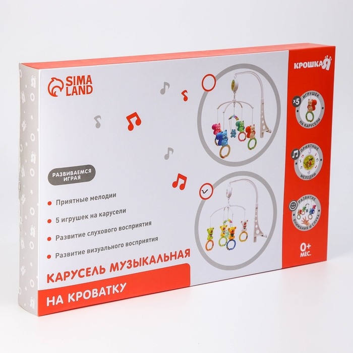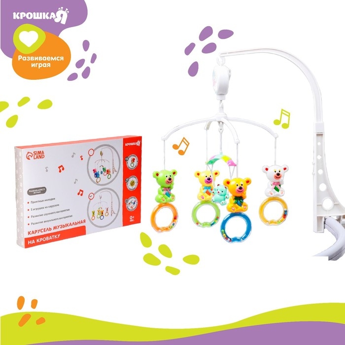 Вращающаяся музыкальная карусель поможет убаюкать малютку. Во время бодрствования грудничок будет с интересом наблюдать за движением весёлых фигурок, научится распознавать звуки, цвета и формы. Подросший малыш начнёт тянуться ручками к игрушкам: так ребёнок тренирует координацию движений и пробует оценивать расстояние до предметов.
