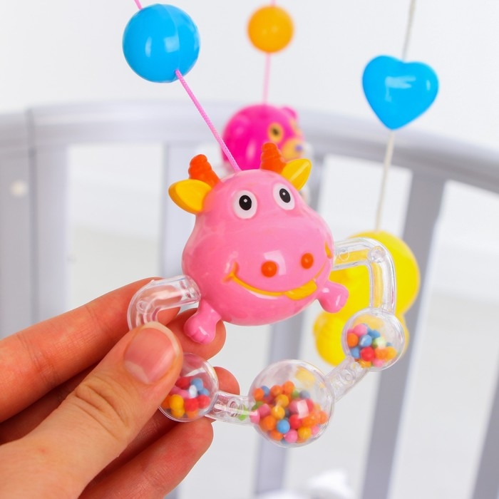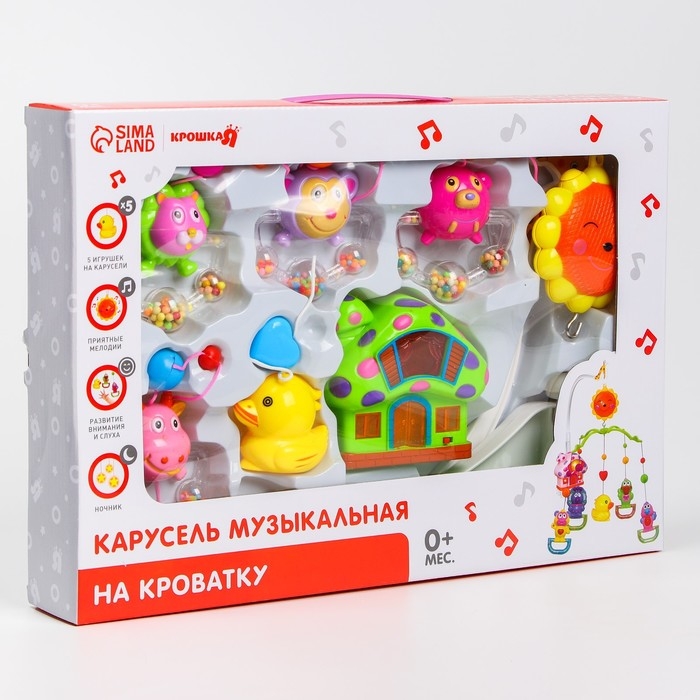 Вращающаяся музыкальная карусель поможет убаюкать малютку. Во время бодрствования грудничок будет с интересом наблюдать за движением весёлых фигурок, научится распознавать звуки, цвета и формы. Подросший малыш начнёт тянуться ручками к игрушкам: так ребёнок тренирует координацию движений и пробует оценивать расстояние до предметов.
