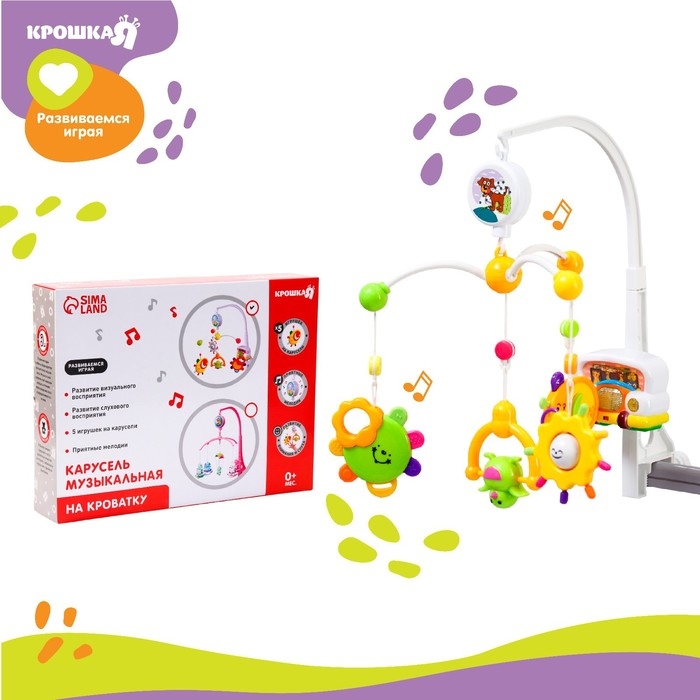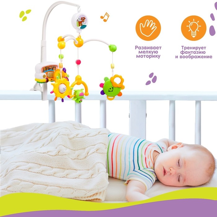 Вращающаяся музыкальная карусель поможет убаюкать малютку. Во время бодрствования грудничок будет с интересом наблюдать за движением весёлых фигурок, научится распознавать звуки, цвета и формы. Подросший малыш начнёт тянуться ручками к игрушкам: так ребёнок тренирует координацию движений и пробует оценивать расстояние до предметов.