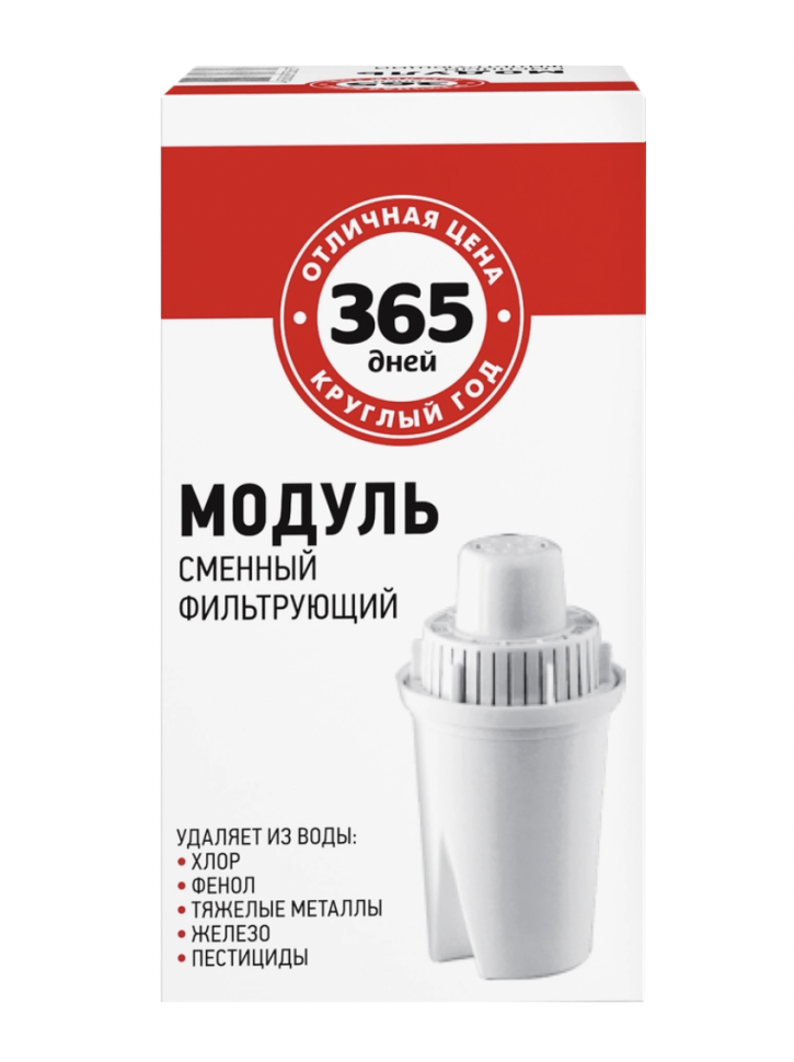 365 ДНЕЙ. Модуль сменный фильтрующий от бренда 365 ДНЕЙ – аксессуар, предназначенный для доочистки и умягчения воды централизованных систем питьевого водоснабжения. Благодаря использованию уникальных волокнистых сорбционных материалов, высококачественного кокосового активированного угля и комбинации ионообменных смол модуль снижает жесткость воды, устраняет неприятный вкус и запах, надежно задерживает вредные примеси.