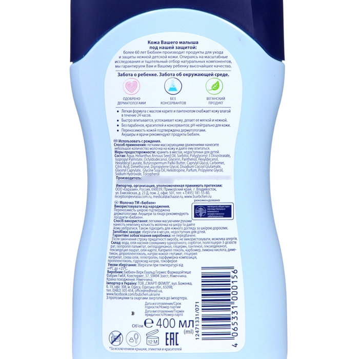 Легкая формула с маслом карите и пантенолом снабжает нежную детскую кожу влагой в течение 24 часов. Молочко быстро впитывается, успокаивает кожу и делает ее мягкой и эластичной. Акушеры и врачи рекомендуют Бюбхен.