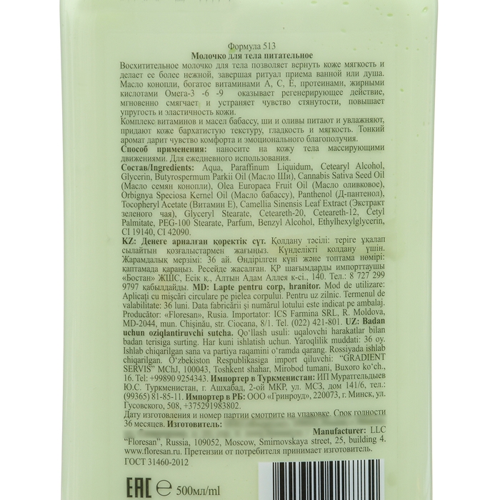 Насыщенное питательное молочко для тела Floresan с маслом семян конопли и маслом оливы - это интенсивный уход, превращающий вашу ежедневную рутину в нежное и питательное прикосновение к коже.