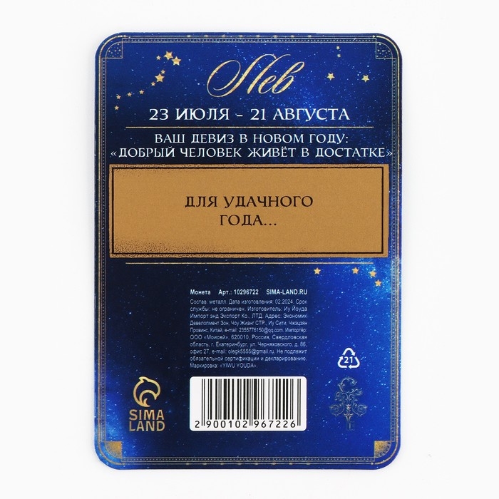 Монета гороскоп 2025 новогодняя «Лев» на Новый год, латунь, диам. 2, 5 см