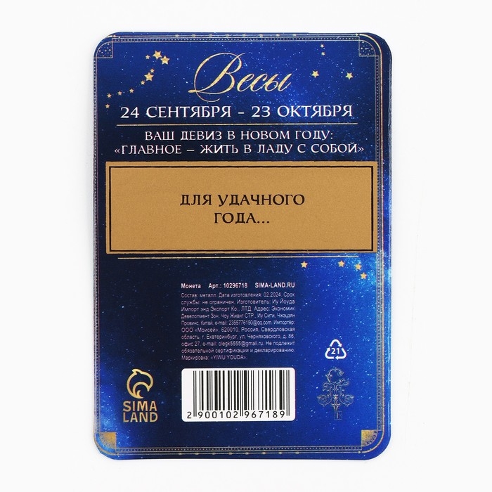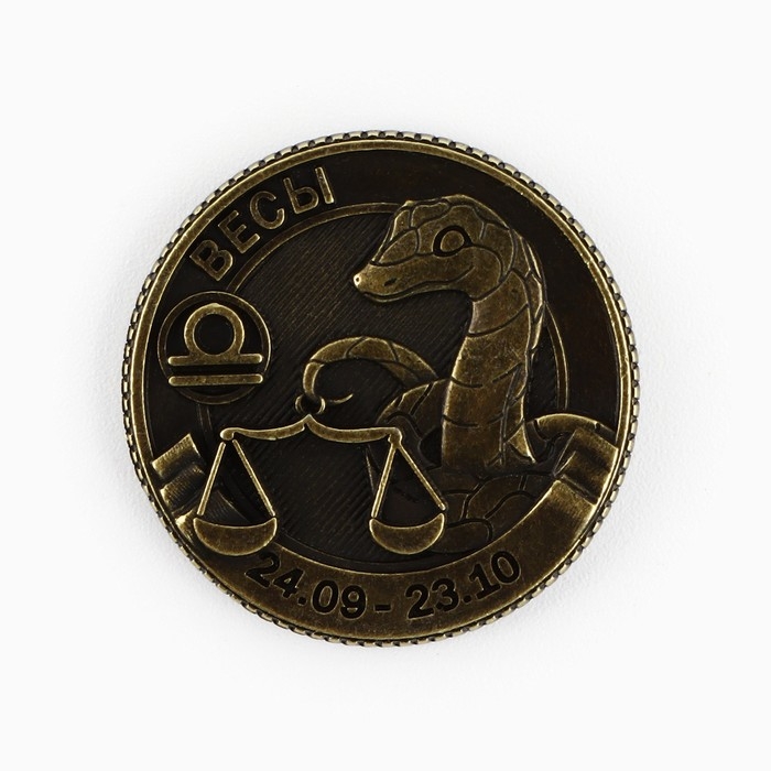 Монета гороскоп 2025 новогодняя «Весы» на Новый год, латунь, диам. 2, 5 см