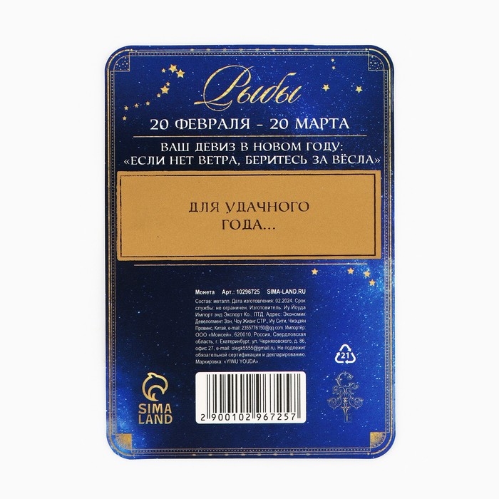 Монета новогодняя гороскоп, амулет 2025 «Новый год: Рыбы», латунь, диам. 2, 5 см