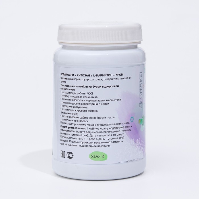 Состав: микронизированные (измельченные до порошка) бурые морские водоросли ламинария (70%) и фукус (30%). хитозан, lL- карнитин, пиколинат хрома.