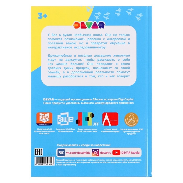 Энциклопедия «Домашние животные» — это необычный и современный подход к развитию вашего малыша. Яркая и красочная книга познакомит с животными, которые уже долгое время живут бок о бок с людьми. Ребёнок узнает, как зовут маму, папу и детёныша, как животные разговаривают между собой и как взаимодействуют с человеком. Эта книга способствует формированию речи ребёнка, развивает память, расширяет кругозор.