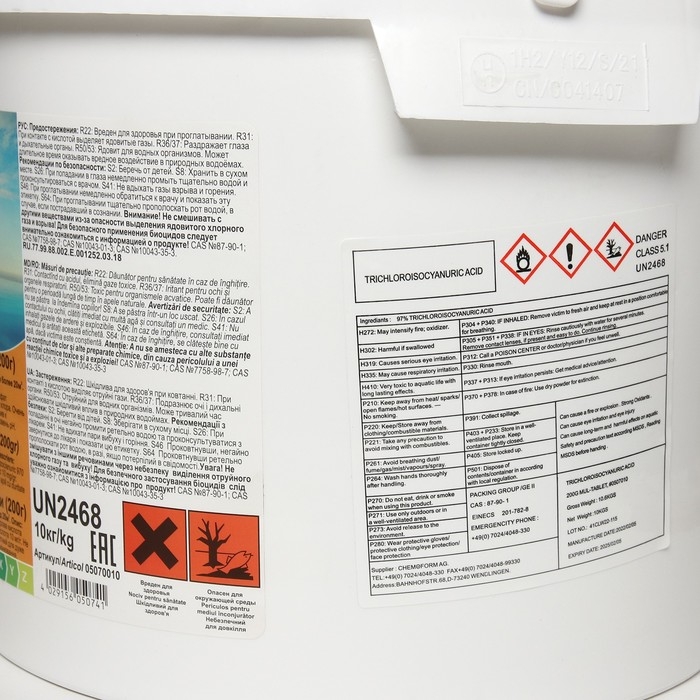 Состав: трихлоризоциануровая кислота 970мг/г, сульфат меди 10мг/г, сульфат алюминия 10мг/г, борная кислота 10мг/г, препарат содержит не менее 80% активного хлора.