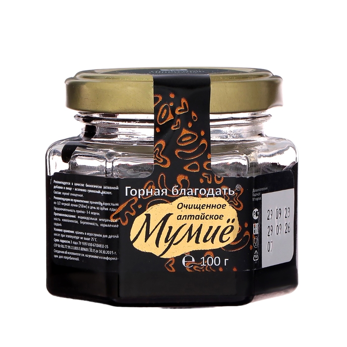 Этот продукт продается в стеклянной банке весом 100 г, что позволяет использовать его в течение длительного времени. Мумиё алтайское "Горная благодать" очищенное в стекле, 100 г - это натуральный и эффективный способ поддержания здоровья и красоты.
