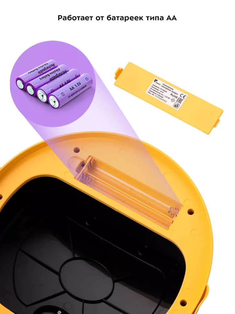 Внутри мусорного ведра находится внутреннее пластиковое ведро с ручкой, которое легко очистить от мусора и помыть при необходимости. Устройство работает от 4 батареек типа АА, которых хватает на долгое время. Батарейки в комплект не входят.