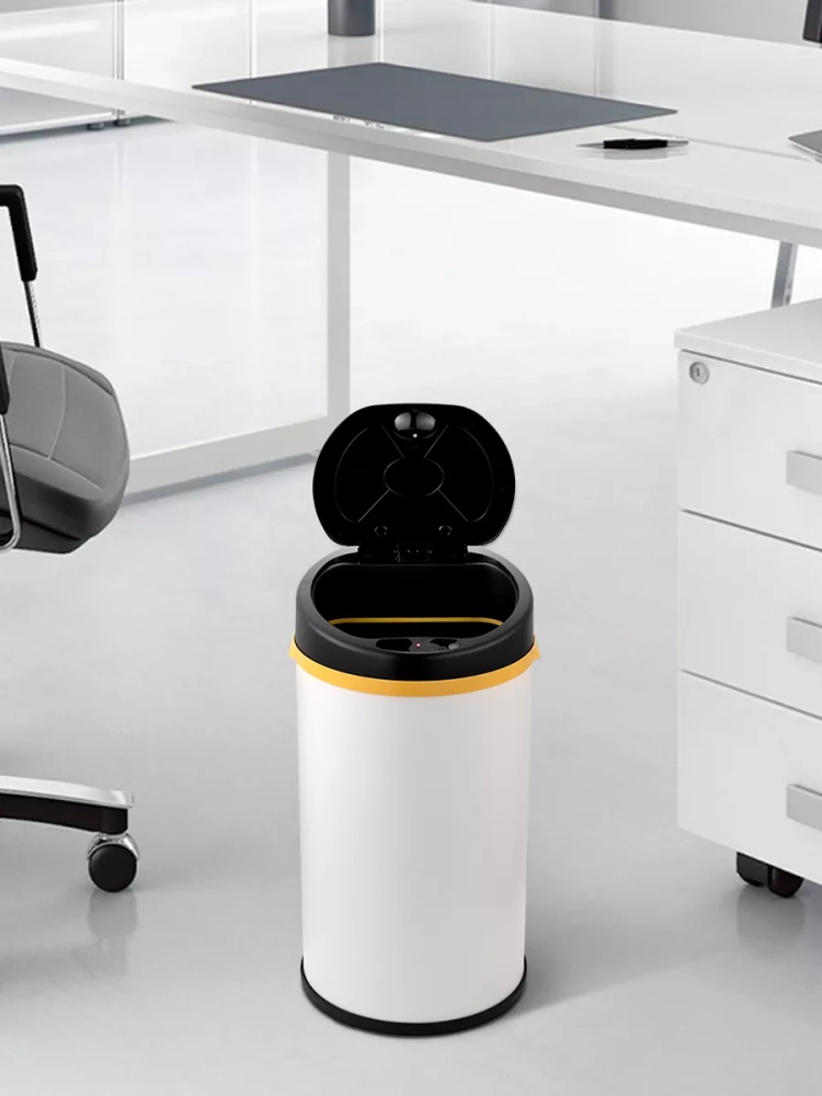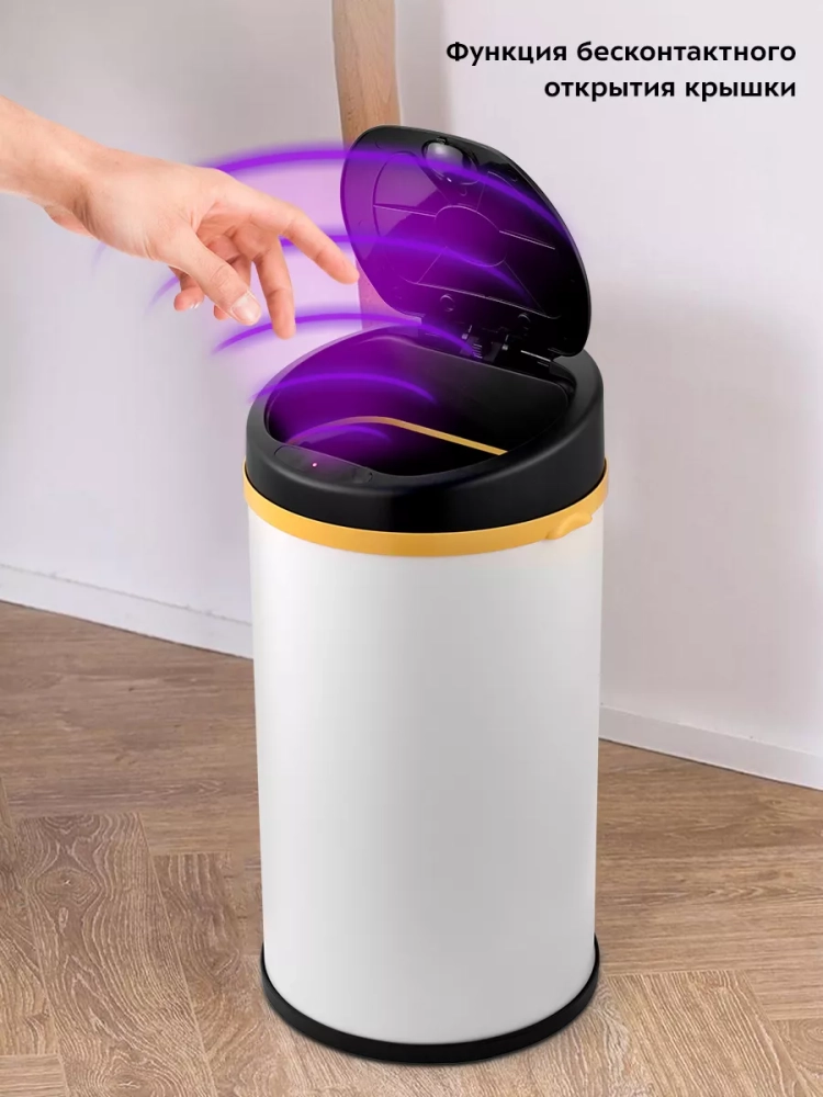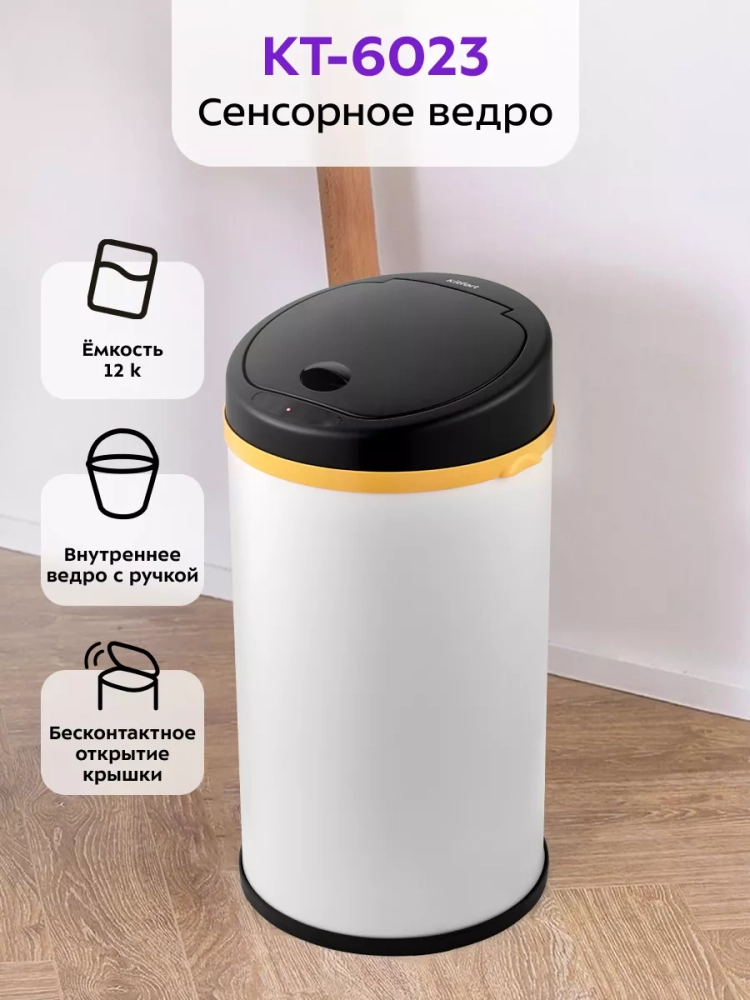 Сенсорное мусорное ведро оснащено инфракрасными датчиками. Такое ведро открывается и закрывается автоматически, и его не нужно касаться при выбрасывании мусора. Датчики ведра КТ-6023 расположены на крышке. Когда объект появляется в зоне действия датчиков, откидная крышка ведра автоматически открывается и закрывается через 6 секунд. На крышке также есть небольшая ручка. При желании можно отключить датчики и пользоваться устройством КТ-6023 как обычным мусорным ведром.