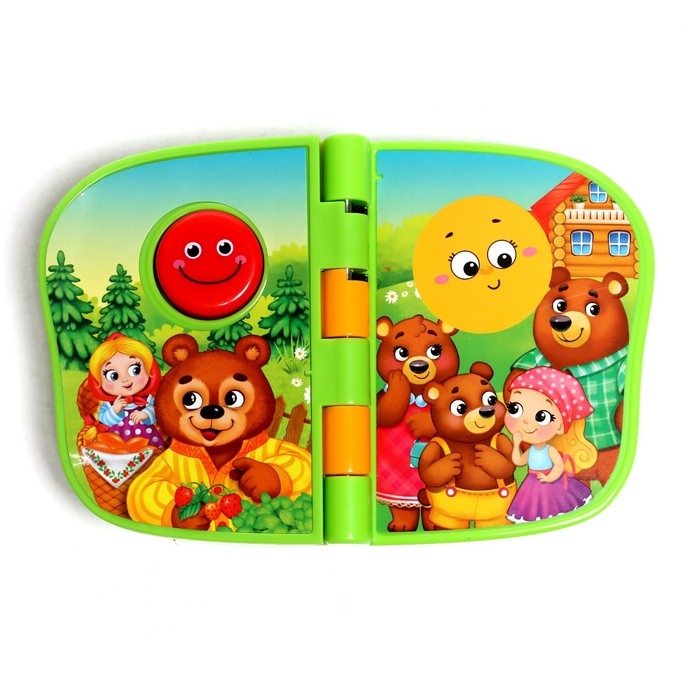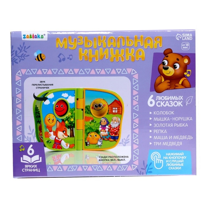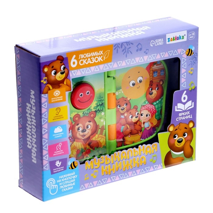 Книжка оснащена музыкальным модулем и проигрывает 5 весёлых мелодий. Они включаются при перелистывании страниц либо от нажатия на кнопку.