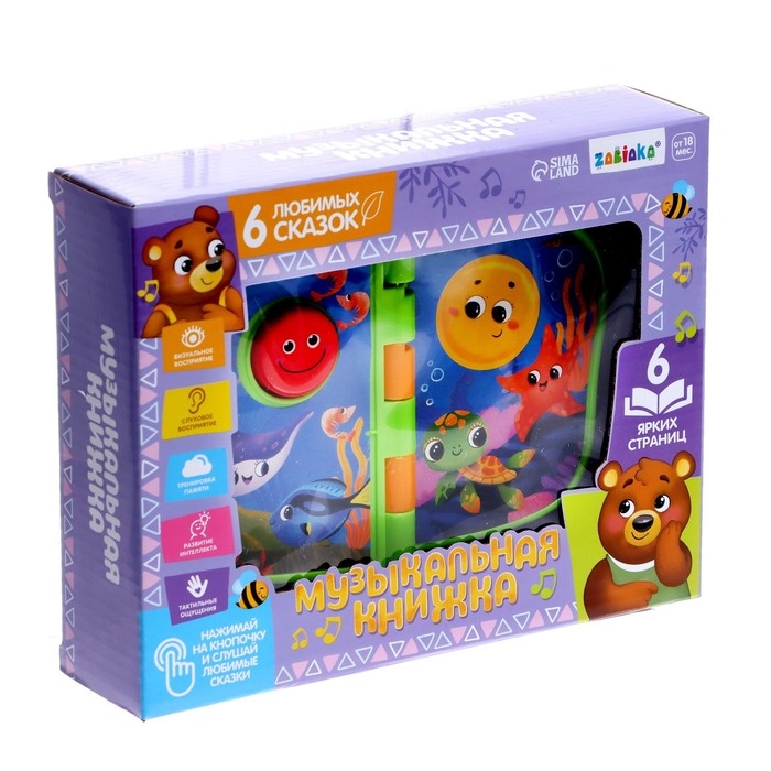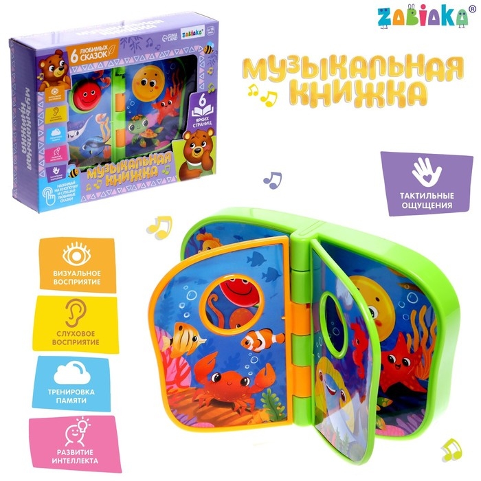 Книжка оснащена музыкальным модулем и проигрывает 5 весёлых мелодий. Они включаются при перелистывании страниц либо от нажатия на кнопку.