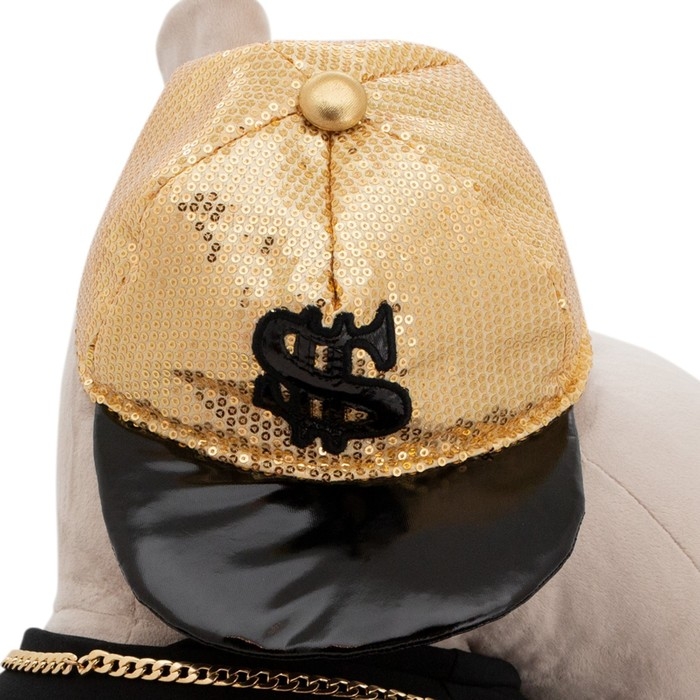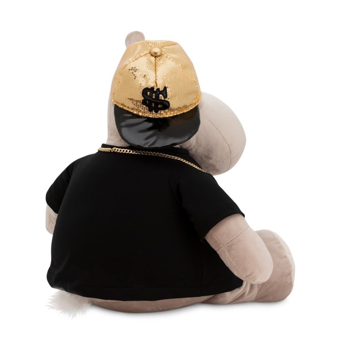 - Бегемот одет в тематическую футболку и яркую блестящую кепку, а золотая цепь дополняет образ.