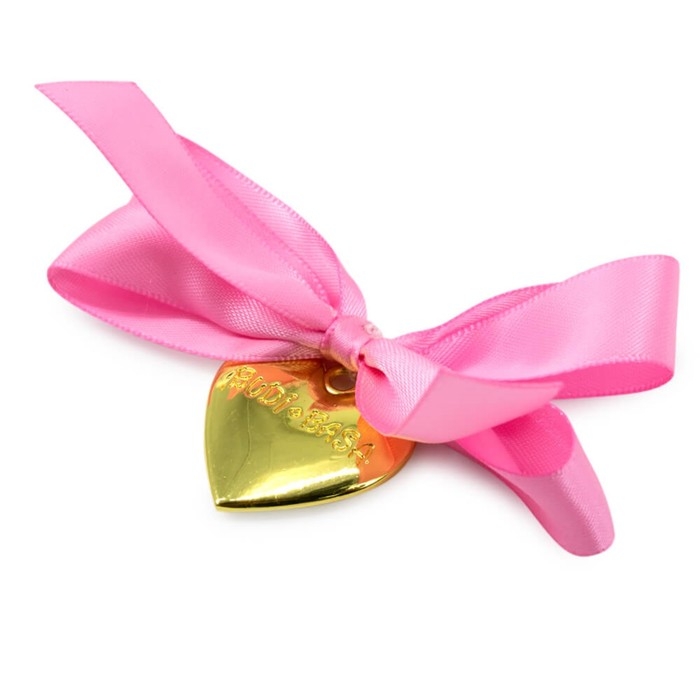 - На кошечке шикарный бант ручной работы из атласной ленты цвета розовой сладкой ваты. В середине бантик украшает сердечко из металла цвета античного золота. На сердечке выдавлен маленький след кошачьей лапки.