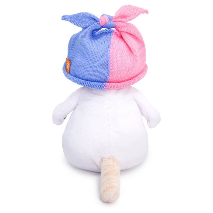 - На кошечке вязаная шапка из розовой и голубой пряжи с завязывающимися концами сверху. Также на Ли‑Ли объёмный бант в бело‑розовую клеточку.