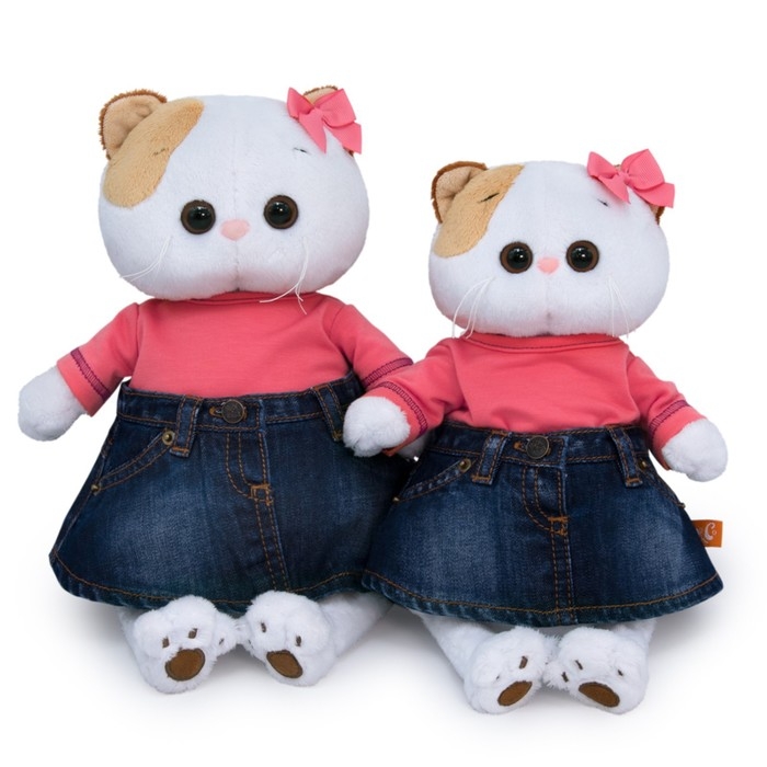 - Кошечка Ли-Ли встречает яркое лето в классической юбочке цвета индиго, сшитой из плотного денима с потёртостями. Стильный образ дополняет шикарный лонгслив цвета коралловой фиалки. На ушке у Ли‑Ли нежный бантик из репсовой ленты клубнично‑розового цвета.