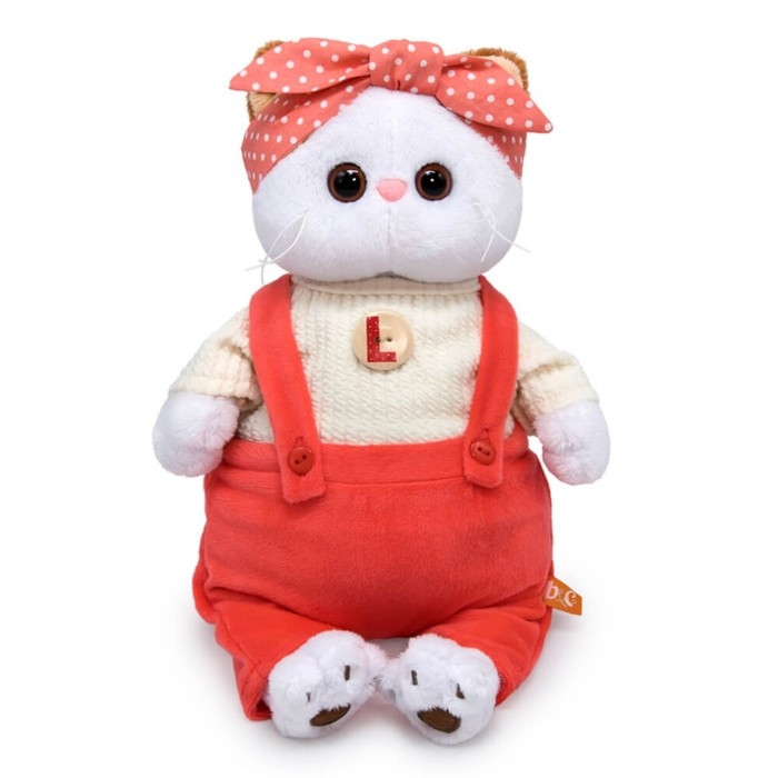 - На кошечке штанишки на лямочках из нежного софта кораллового цвета и трикотажная блузка молочного цвета. Спереди на блузочке именная пуговица с буквой L. Также на Ли‑Ли забавная повязочка лососёвого цвета в белый горошек.