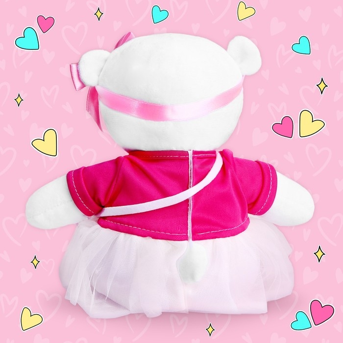 - Декоративная деталь, в виде ленточки и розового платья с сумочкой через плечо, придаёт игрушке особый шарм и делает её уникальным подарком.