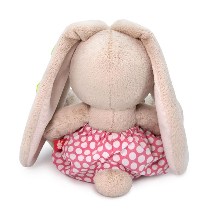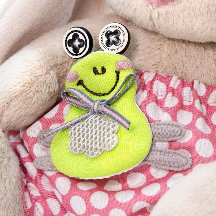 - На зайке забавные х/б шароварчики цвета розовой герани в крупный белый горох. В лапке зайка держит детскую игрушку в виде смешного лягушонка. На ушке у малышки атласный бант цвета сочного салата.