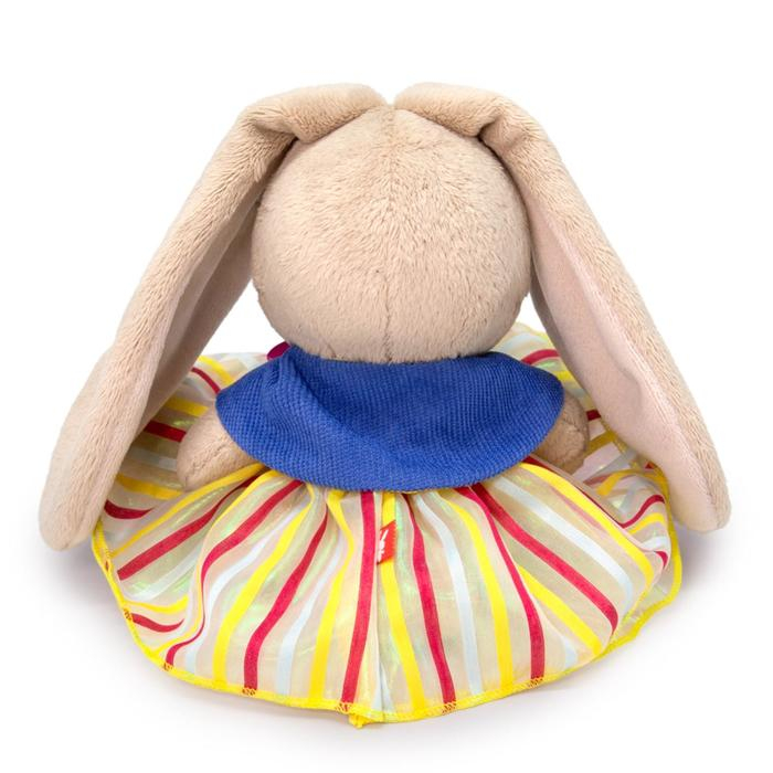 - На зайке полосатая юбочка из ткани с блеском и круглый воротничок плотного голубого цвета на розовом бантике из атласной ленты. На ушке брошка‑цветочек из кристаллов с пайетками.