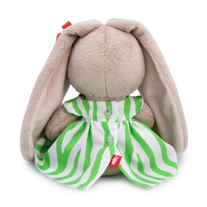 - На зайке милое платье. Спереди на платьице нашивка в виде маленькой зебры. На ушке бантик цвета персика.