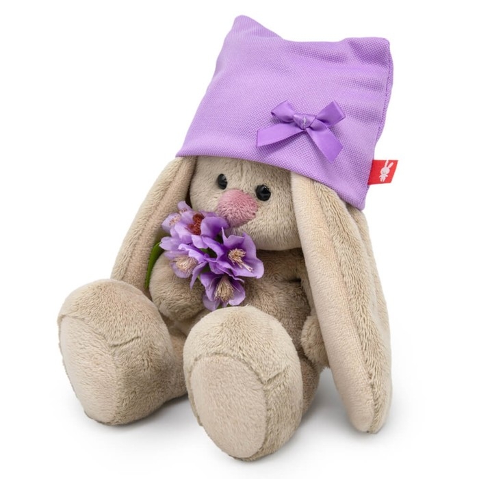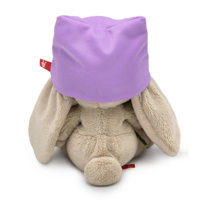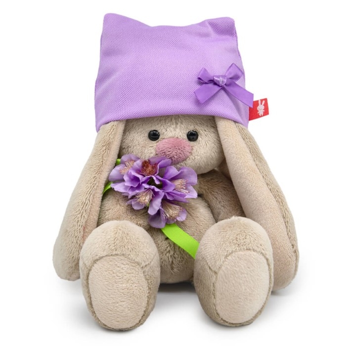 - На зайке симпатичная сиреневая шапочка из трикотажа. Шапка украшена атласным бантиком. В лапках малышка Ми держит милый букетик весенних цветов, перевязанных салатовой атласной лентой.