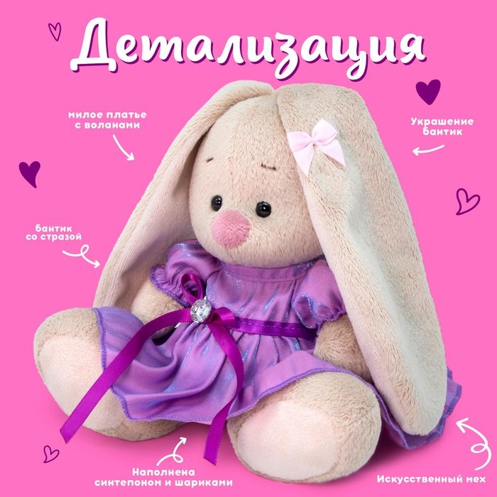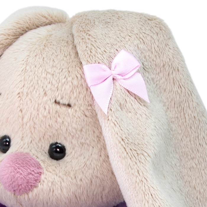 - На зайке нарядное платье из атласа Monoray с эффектом шан‑жан цвета аметистовой орхидеи. По талии платье украшено фиолетовой атласной лентой, завязанной в бант. На ушке шелковый бантик, словно лепесток нежной розы.