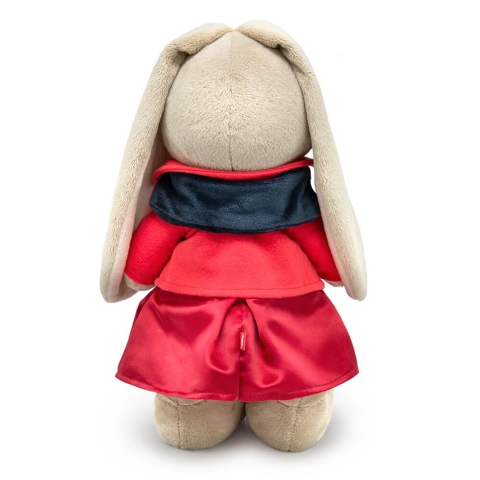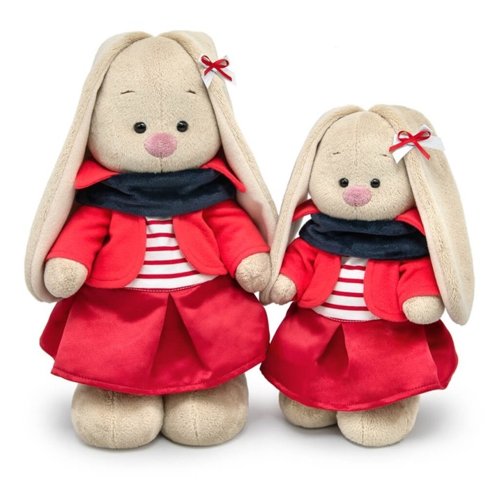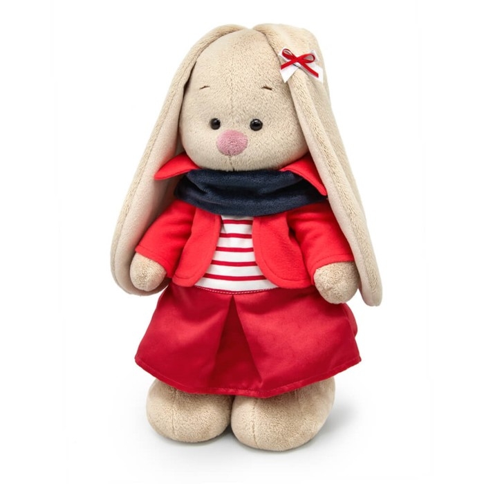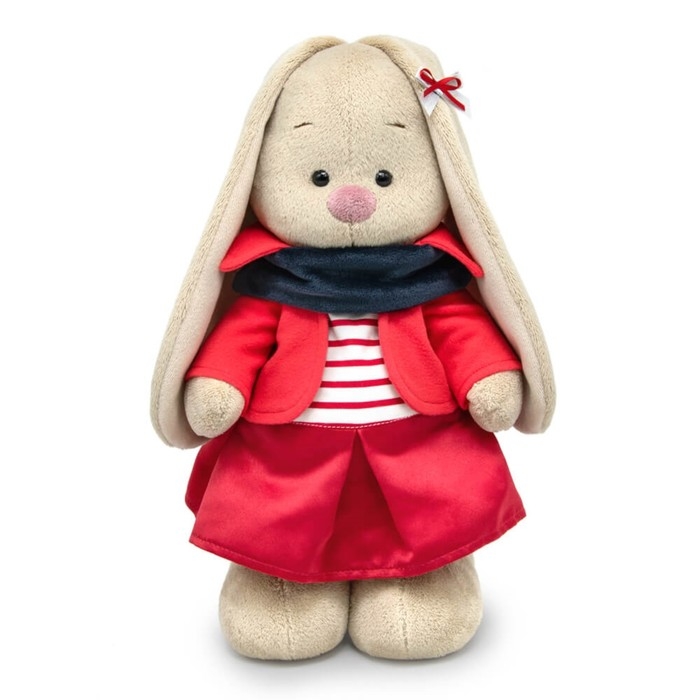 - На зайке мягкий жакет из нежного флиса, юбочка из плотного крепа, тельняшка в красно‑белую полоску и снуд из софта графитового цвета. Завершает комплект двойной атласный бантик ручной работы.