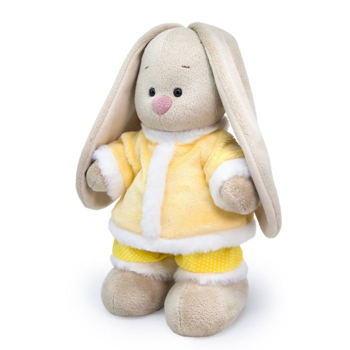 Милая мягкая игрушка «Зайка Ми» — это хороший подарок для ребёнка или кукольного коллекционера. На зайке нежно‑жёлтый комплект. Шубка из ворсистого софта с отделкой из белого короткого искусственного меха. В комплекте штанишки в мелкий горошек с отделкой из меха. Одежду с игрушки можно снять.