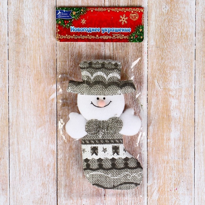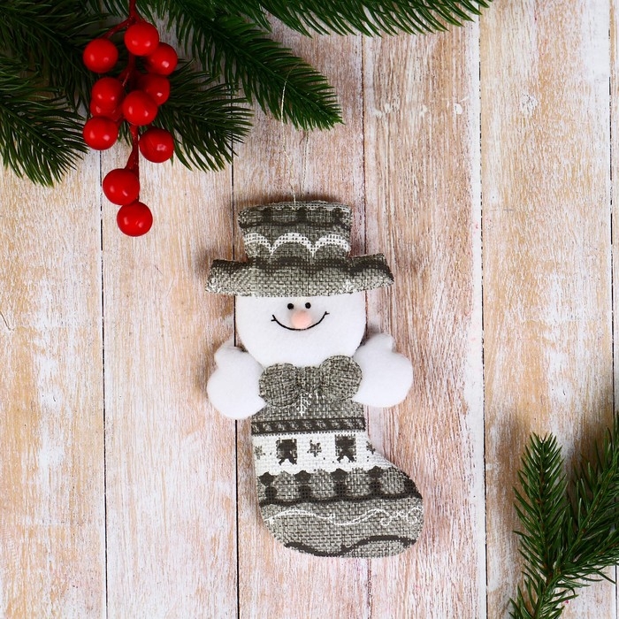 Мягкая подвеска "Снеговик в костюмчике с орнаментом лес в носке" 7х14 см, серый