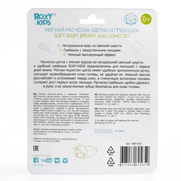 Расческа-щетка с мягким ворсом из натуральной овечьей шерсти и удобный гребешок ROXY-KIDS предназначены для малышей и новорожденных. Мягкая пушистая щетка имеет удобную эргономичную ручку, улучшает кровообращение кожи головы, не царапая её. Нежный массаж расслабляет и успокаивает перед сном, а стимуляция волосяных луковиц ускоряет рост первых волос малыша. Натуральная щетка из овчины позволит пригладить волосики и придать им аккуратный вид. А с помощью гребешка с частыми закругленными зубчиками удобно расчесывать запутавшиеся и скатавшиеся волосы. Набор для расчесывания ROXY-KIDS отличает приятный дизайн, прочность и экологичность материалов. Гребешок и расческа-щетка отлично дополняют друг друга, и в дальнейшем с их помощью вы сможете научить ребенка причесываться самостоятельно.