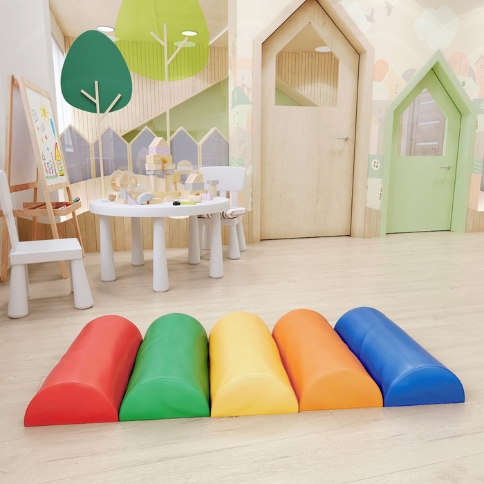 Спортивно-игровой модуль «Дорожка» — то, что нужно для активных развлечений ребёнка. Малыш с удовольствием будет бегать по разноцветным мягким полуцилиндрам, тренируя тем самым ловкость и гибкость.