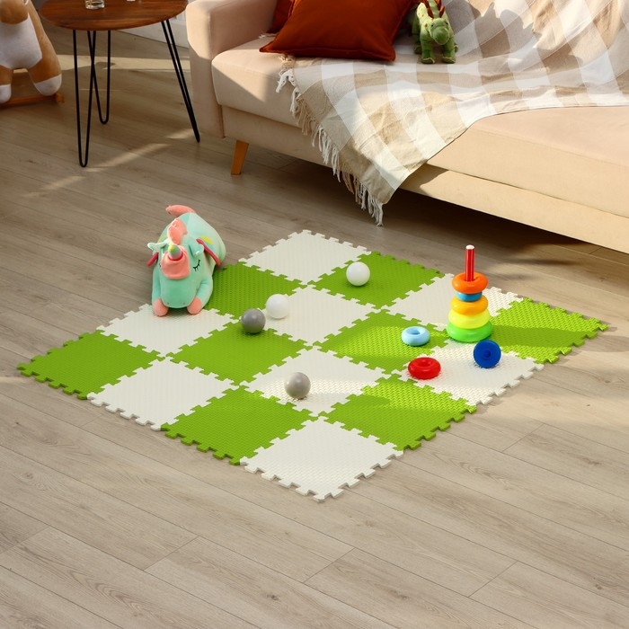 - Комплект состоит из 9 частей размером 33 × 33 см. Общая площадь коврика составляет 1 м2.