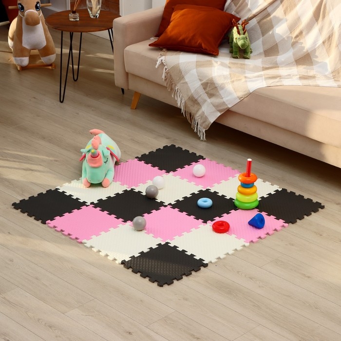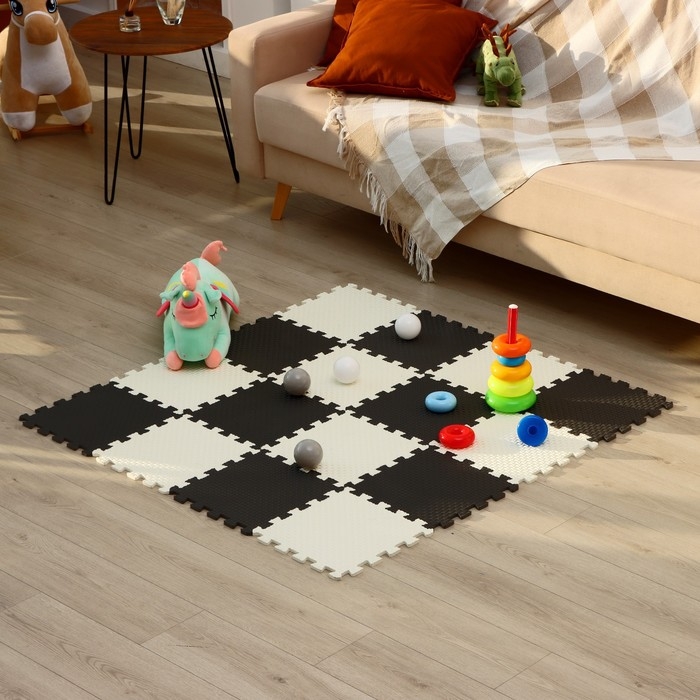 - Комплект состоит из 9 частей размером 33 × 33 см. Общая площадь коврика составляет 1 м2.