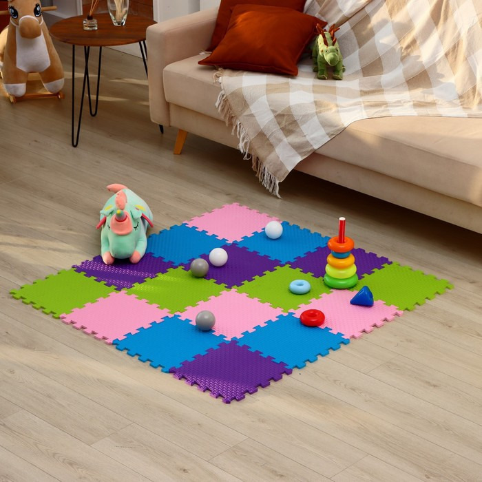 - Комплект состоит из 9 частей размером 33 × 33 см. Общая площадь коврика составляет 1 м2.