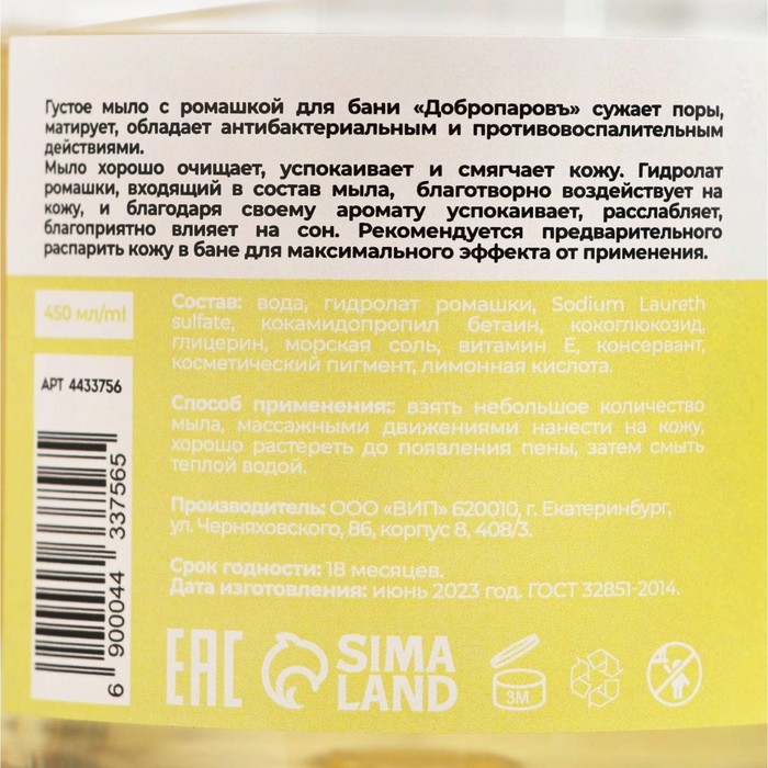 Мыло густое для волос и тела "Ромашковое", банное, Добропаровъ 450 мл