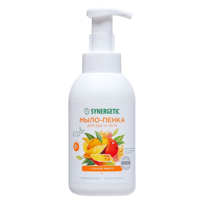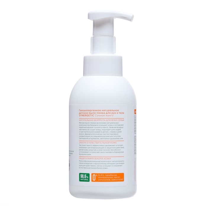 Мягкое детское мыло-пенка для рук и тела SYNERGETIC Сочное манго на основе натуральных компонентов бережно очищает кожу и оставляет приятный аромат сочного манго. Экстракт манго эффективно увлажняет и питает, оказывает регенерирующее и защитное действие, делая кожу упругой и эластичной.