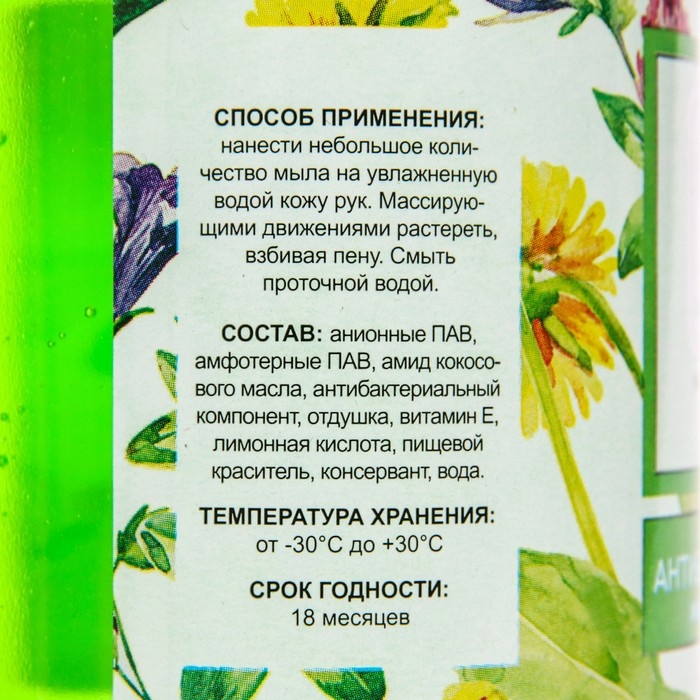 Способ применения: нанести небольшое количество мыла на влажную кожу рук, массирующими движениями растиреть, взбивая мыло в пену. Смыть проточной водой.