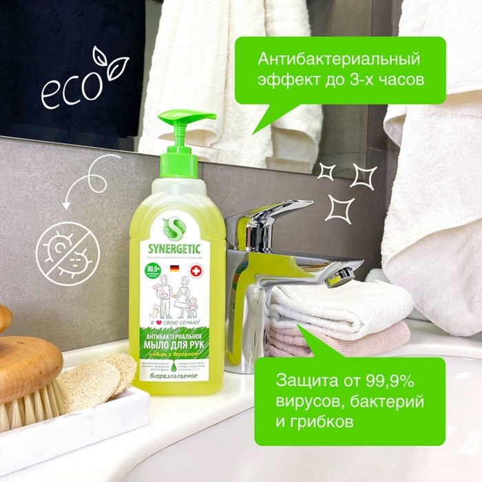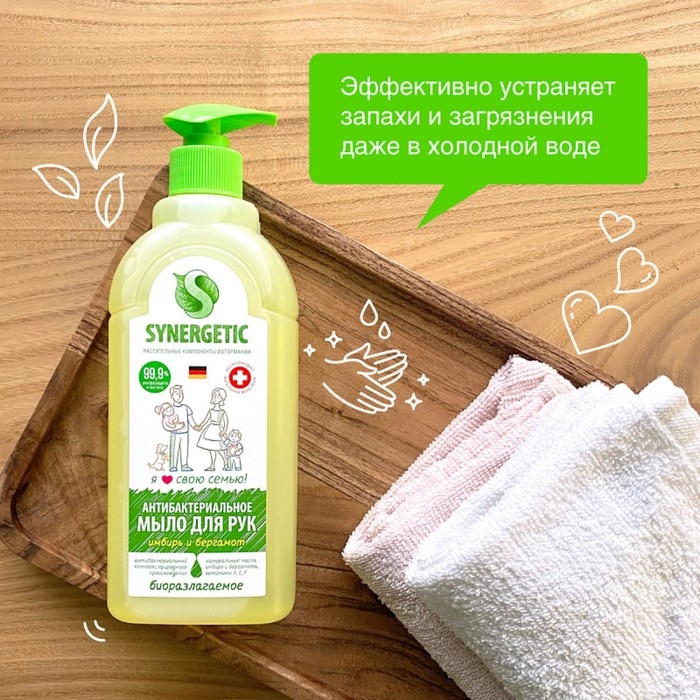 Мыло жидкое Synergetic «Имбирь и бергамот», гипоаллергенное, антибактериальное, 500 мл
